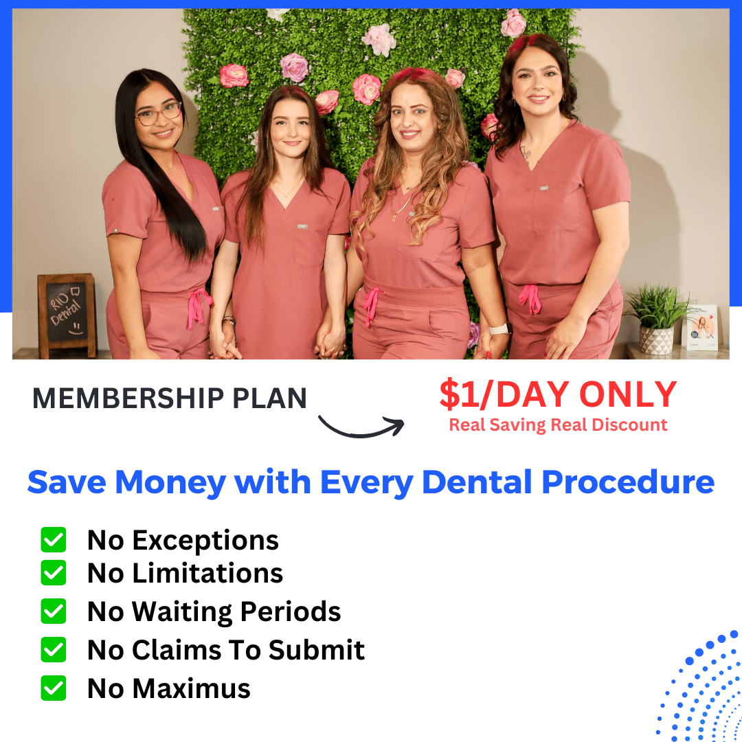 Without insurance? We've got you covered. With our in-house membership plan at Rio Dental Emergency for only $1/day . you can enjoy 20-30% savings on dental procedures.